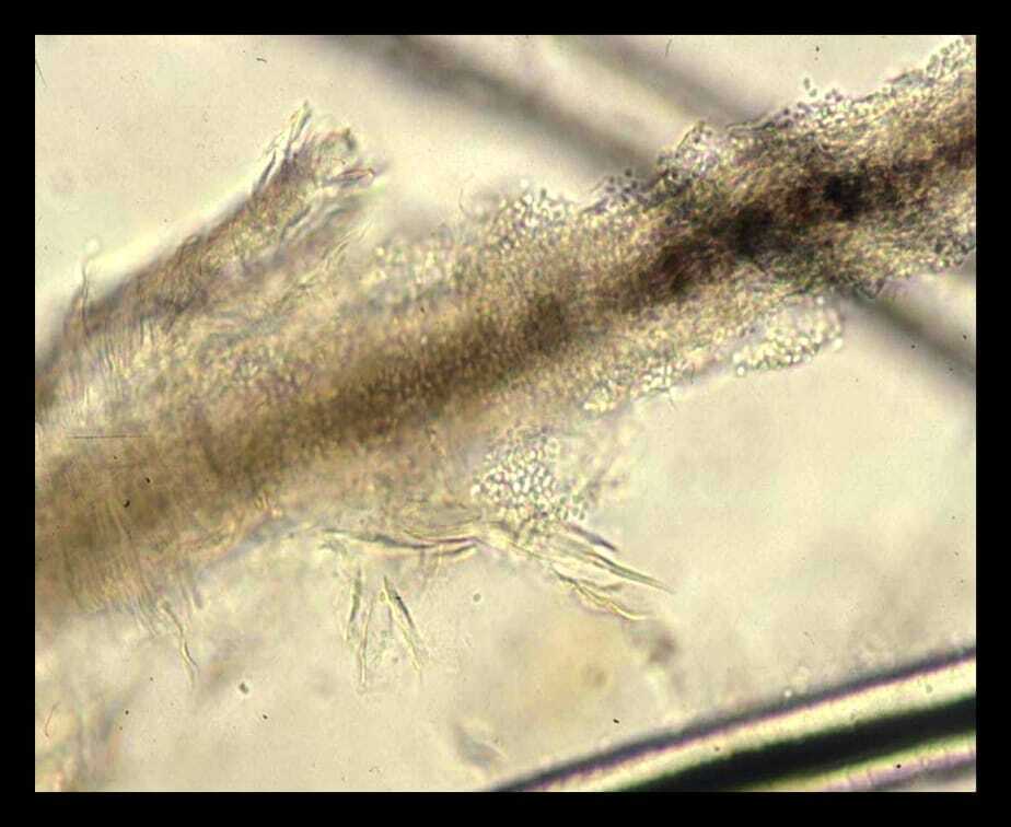 Bei schwacher Vergrößerung (x40) werden Demodex-Milben (Abbildung 2) oft in Verbindung mit den Haarschäften gefunden, so dass in dem Falle keine invasiveren Hautausschabungen erforderlich sind. Cheyletiellen Milben können ebenfalls durch Auszupfen der Haare diagnostiziert werden. Entweder die Milbe selbst oder, was häufiger der Fall ist, die von feinen Fäden am Haarschaft umschlossenen Eier (Abbildung 3). Weiterhin können sowohl Dermatophytosen nachgewiesen werden (Abbildung 4), als auch juckreizbedingte Haarschäden und Hyperkeratosen (Abbildung 5).