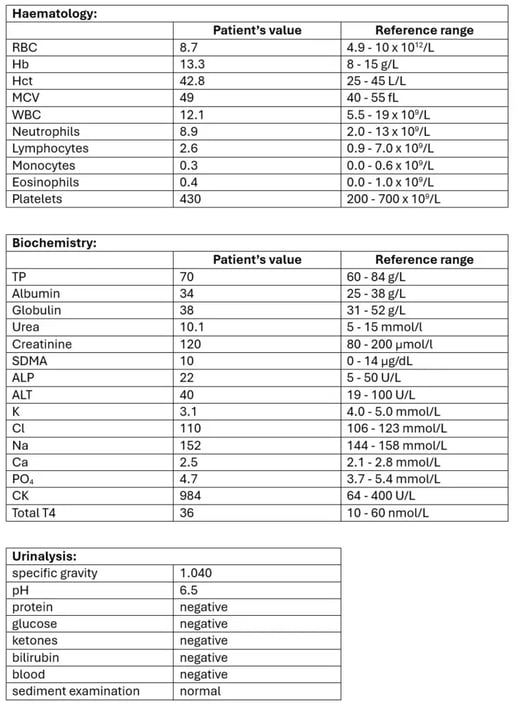- Haematology, serum biochemistry (including total thyroxine) and urinalysis (which would allow us to check for causes of weakness, PU/PD and hypertension, such as ruling in/out anaemia, CKD, or diabetes).