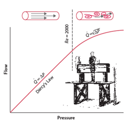 Les souffles innocents et pathologiques partagent de nombreuses caractéristiques physiologiques. Tout d'abord, ils sont tous deux le résultat d'un écoulement sanguin turbulent, qui se produit lorsque l'écoulement laminaire cesse. Le flux sanguin suit la loi de Darcy : le flux est égal à la différence de pression le long d'une structure tubulaire, divisée par sa résistance. Initialement, le débit peut augmenter linéairement avec une augmentation de la pression anatomique ; cependant, après un certain seuil, le débit ne suit plus une trajectoire linéaire mais augmente à la racine carrée de la pression anatomique. Par conséquent, après certains niveaux de gradient de pression, le flux devient turbulent, comme l'explique la figure 1.