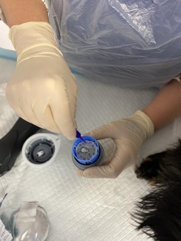 La grande majorité des capteurs peuvent être posés sur des patients conscients, mais l’installation du capteur nécessite une légère pression. Pour certains patients félins, notamment ceux qui ne sont pas habitués à la pose de capteurs, une sédation ou une anxiolyse à l’aide de gabapentine ou de butorphanol peut être utile. Si les patients diabétiques sont déjà sédatés pour d’autres procédures (par exemple pour l’imagerie), il est recommandé de profiter de l’occasion pour placer le capteur. Chaque capteur est fourni avec un applicateur (Figure 2), nécessaire pour installer correctement le disque du capteur.