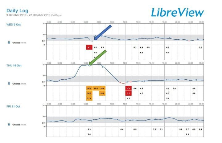 Ce chat est en phase de rémission. Une hypoglycémie est observée au jour 1 (flèche bleue), tandis qu’une période d’hyperglycémie apparaît au jour 2 (flèche verte), coïncidant avec un déplacement à la clinique. Cela illustre l’effet du stress sur la glycémie et montre comment les décisions basées sur ces lectures peuvent conduire à une augmentation de la dose d’insuline.