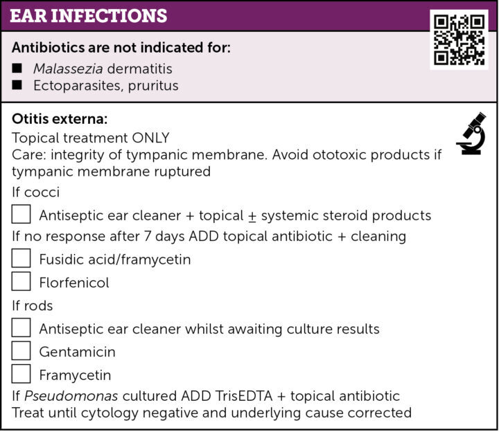 The British Small Animal Veterinary Association (BSAVA) and its affiliated group, the Small Animal Medicine Society (SAMSoc), has recently updated its PROTECT ME guidelines for “Antibiotic use in our practice” (Figure 1). The new guidelines promote the use of topical steroids and antiseptic cleaners for otitis externa, moving away from using antimicrobials for all first-line cases and encouraging education around antibiotic stewardship.