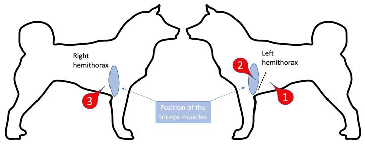 Structured guide to auscultation procedureAfter trying to make the environment work as best you can, the first step in auscultation is palpation of the thorax bilaterally. The apical impulse on the left should be stronger than on the right (if the opposite is true, it suggests significant cardiomegaly). Consider where the apical impulse is most prominent on the left and right – these are the regions referred to as “apex” (Figure 5). In many dogs, this is close to rib spaces 5 to 7, but that is a vague guideline and does not apply consistently across breeds. Also, when the heart is remodelled, the normal position of the apical impulse may be displaced.