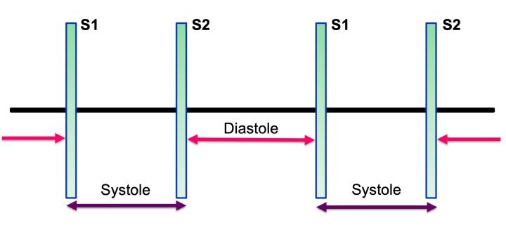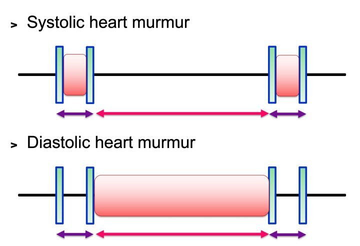 Sometimes it can be challenging to differentiate between systole and diastole. Diastole tends to be longer than systole (more difficult to identify at higher heart rates) and is also variable in duration in dogs with sinus arrhythmia. If you can hear a murmur, then – statistically speaking – it is probably present in systole; diastolic murmurs are incredibly rare in companion animals (Figure 7).