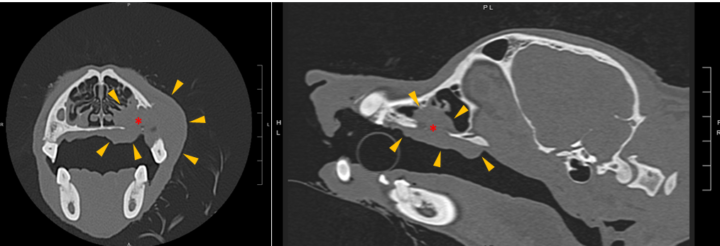 Imaging of the head should be performed via radiography or, ideally, computed tomography (CT) to assess the extent of local disease (Figure 2). Computed tomography is significantly more sensitive at detecting bone lysis and adjacent tissue invasion compared to radiographs, both of which are important factors for surgical planning (Ghirelli et al., 2013).