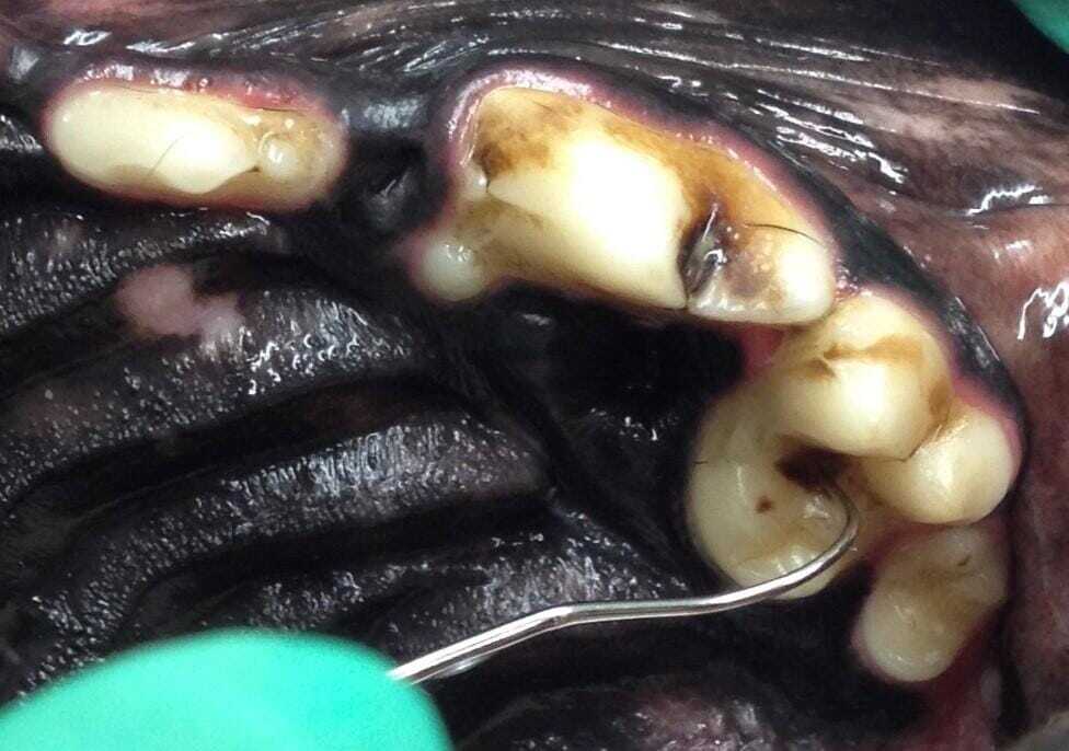 While the mean salivary pH in dogs is high (at 7.5) compared to humans (average pH of 6.5), and regular dietary intake of sugar tends to be lower in dogs, the combination of a number of factors may predispose a dog to the development of caries lesions.