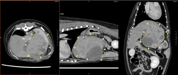 Abdominal ultrasound (US) allows confirmation of the presence of a hepatic mass and aids morphological classification. Surgical planning can be performed based on US in smaller well-demarcated tumours but may not be as reliable in larger tumours, where it can be more challenging to assess mass interaction with adjacent structures such as the caudal vena cava. Triphasic CT (Figure 1) is often superior to US at assessing liver tumours as it allows detection of smaller lesions and can more accurately assess the relationship between large masses and adjacent soft tissue structures. In some studies, imaging features have also been used to differentiate benign from malignant tumours and even specific histological types (Griebie et al., 2017; Kutara et al., 2014). Visualisation of the tumour arterial supply is also essential for planning interventional treatments such as chemoembolisation. Thoracic imaging via either three-view radiographs or CT should be performed to screen for metastasis and complete staging in cases of malignant hepatic tumours.