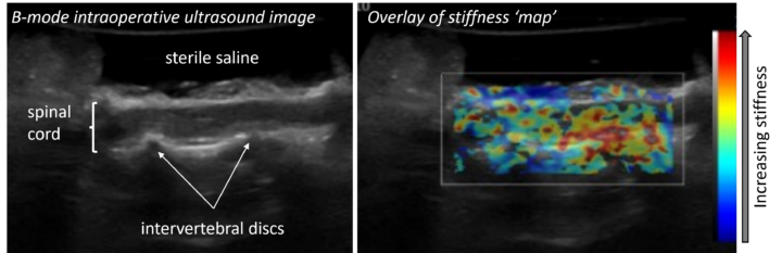 Ultrasound elastography has also been used intraoperatively in dogs undergoing hemilaminectomy for intervertebral disc extrusion. This technique enables the non-invasive measurement of the elasticity (or stiffness) of the spinal cord, which could be correlated to the clinical severity of the injury (Prager et al., 2020). There was a very preliminary suggestion from this study that paraplegic dogs with no deep pain sensation who did not recover ambulation had a stiffer site of injury compared to the surrounding spinal cord. All dogs that recovered had a less stiff site of injury. This is currently being explored further in a prospective study.