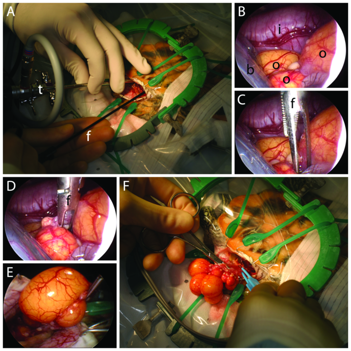 Another area that has seen significant growth in endosurgery is routine sterilisation and the treatment of reproductive diseases. Where I work, endoscopic ovariectomy is the routine sterilisation method of choice for young rabbits, large rodents, exotic carnivores, miniature pigs and primates (Figure 4). Furthermore, prefemoral endoscope-assisted techniques have greatly reduced the need for transplastron coeliotomies in tortoises and other chelonians (Figure 5).