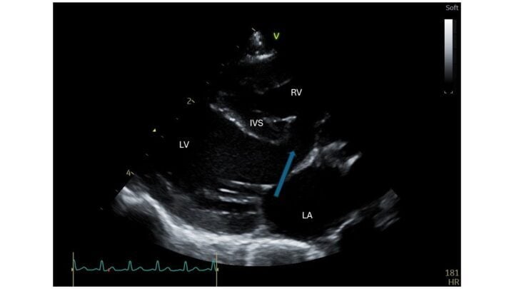 A ventricular septal defect (VSD) is a hole in the interventricular septal wall. It is usually found in the membranous part of the septum, just below the aortic valve. Due to the higher pressures in the left ventricle, blood usually flows from left to right. It is this shunting of blood that causes the heart murmur. Paradoxically, a smaller defect offers more resistance to blood flow and therefore creates a louder murmur, whereas a larger hole offers less resistance, thus causing a quieter murmur. Figure 1 shows a VSD on echocardiography, just below the atrioventricular valves.