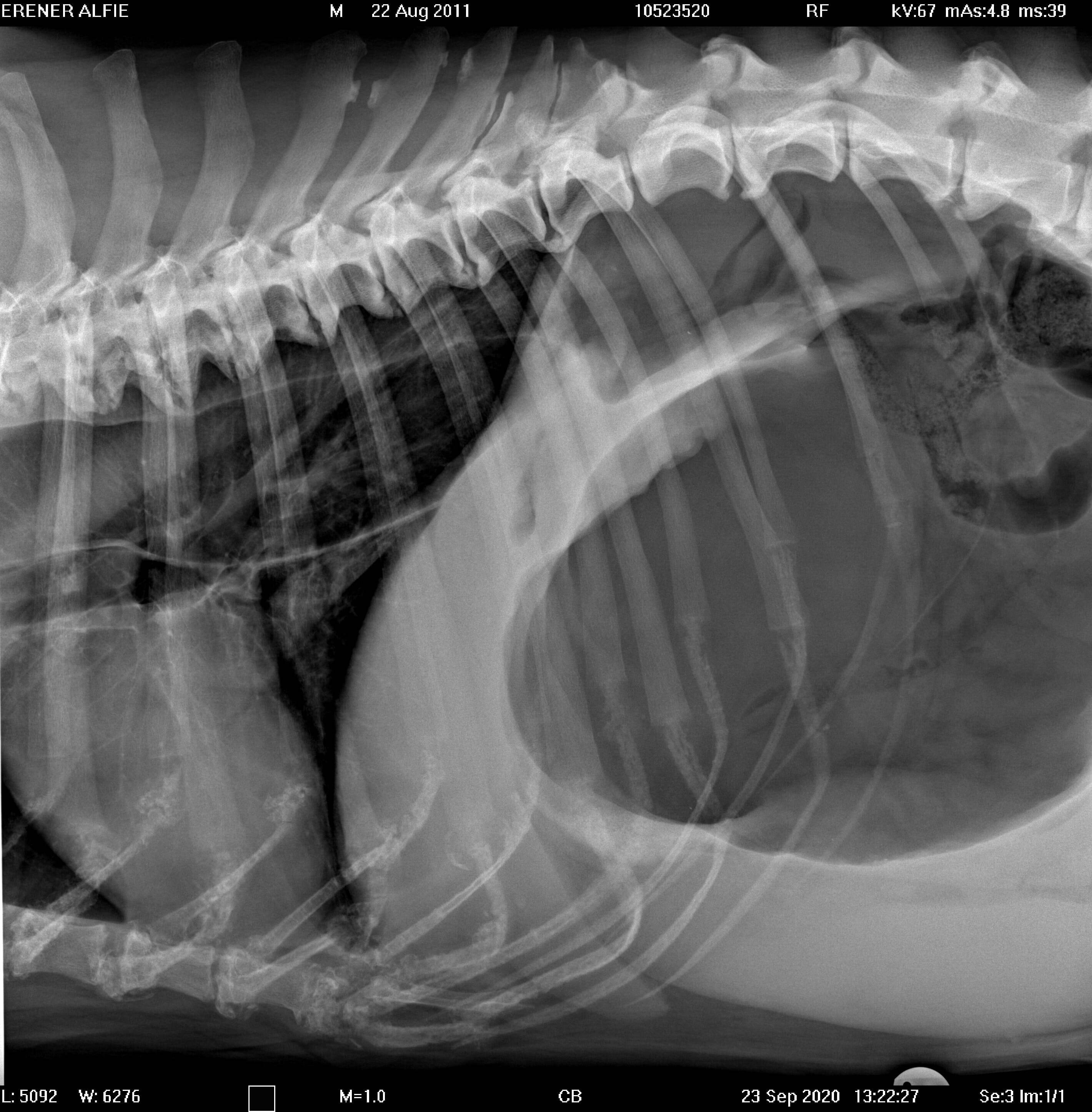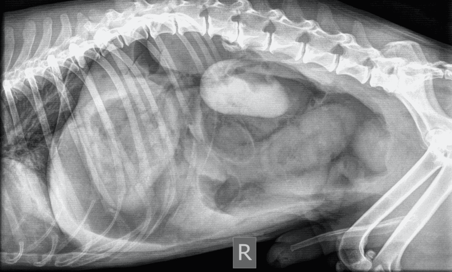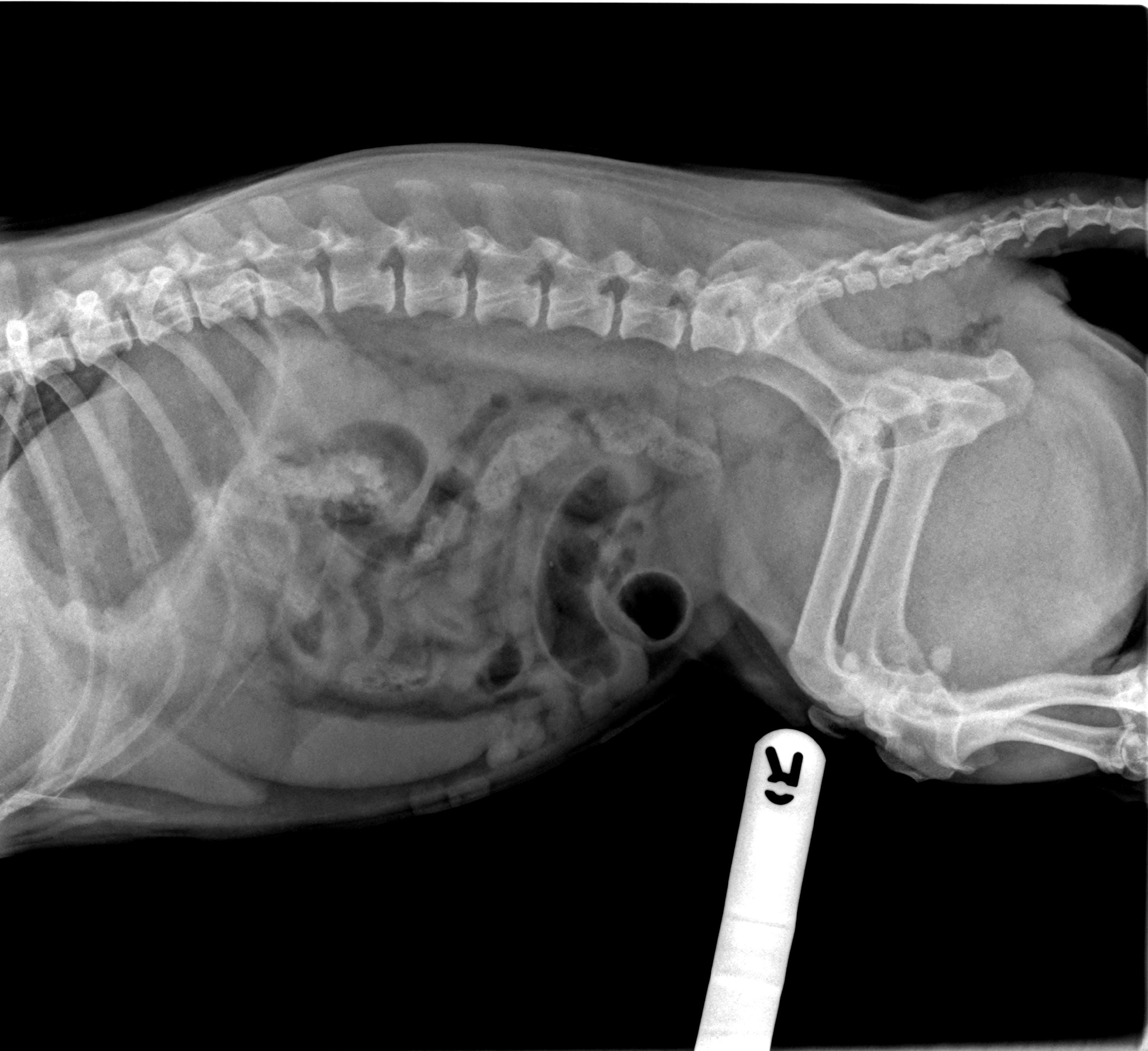 Proximal duodenal and gastric outflow obstruction can cause persistent vomiting with low serum Na, Cl and K; these electrolyte changes should be considered very suspicious even in the absence of imaging findings for obstruction. Abdominal radiographs should include orthogonal views (a right lateral and a ventro-dorsal or dorso-ventral image). Classic radiographic signs for surgical disease can include the “double bubble” for GDV ( Figure 1), two distinct populations of small intestine with obstruction (small and large diameter gut evident with, for example, intussusception, intestinal mass or foreign body; Figure 2) or free abdominal gas with a lack of serosal detail with septic peritonitis. Free abdominal gas can be very obvious ( Figure 3) but a more subtle pneumoperitoneum is best recognised using a horizontal beam radiograph with the patient in lateral recumbency ( Figure 4). Of course, a lack of radiographic changes does not fully exclude a gastrointestinal emergency and abdominal ultrasound can help to identify the problem or guide further diagnostics (eg abdominocentesis of free abdominal fluid). Septic peritonitis due to intestinal leakage will result in an effusion with cytological identification of neutrophils and/or bacteria. If intracellular bacteria can’t be definitively identified but there remains a concern for septic peritonitis, glucose and lactate assessment can be helpful.