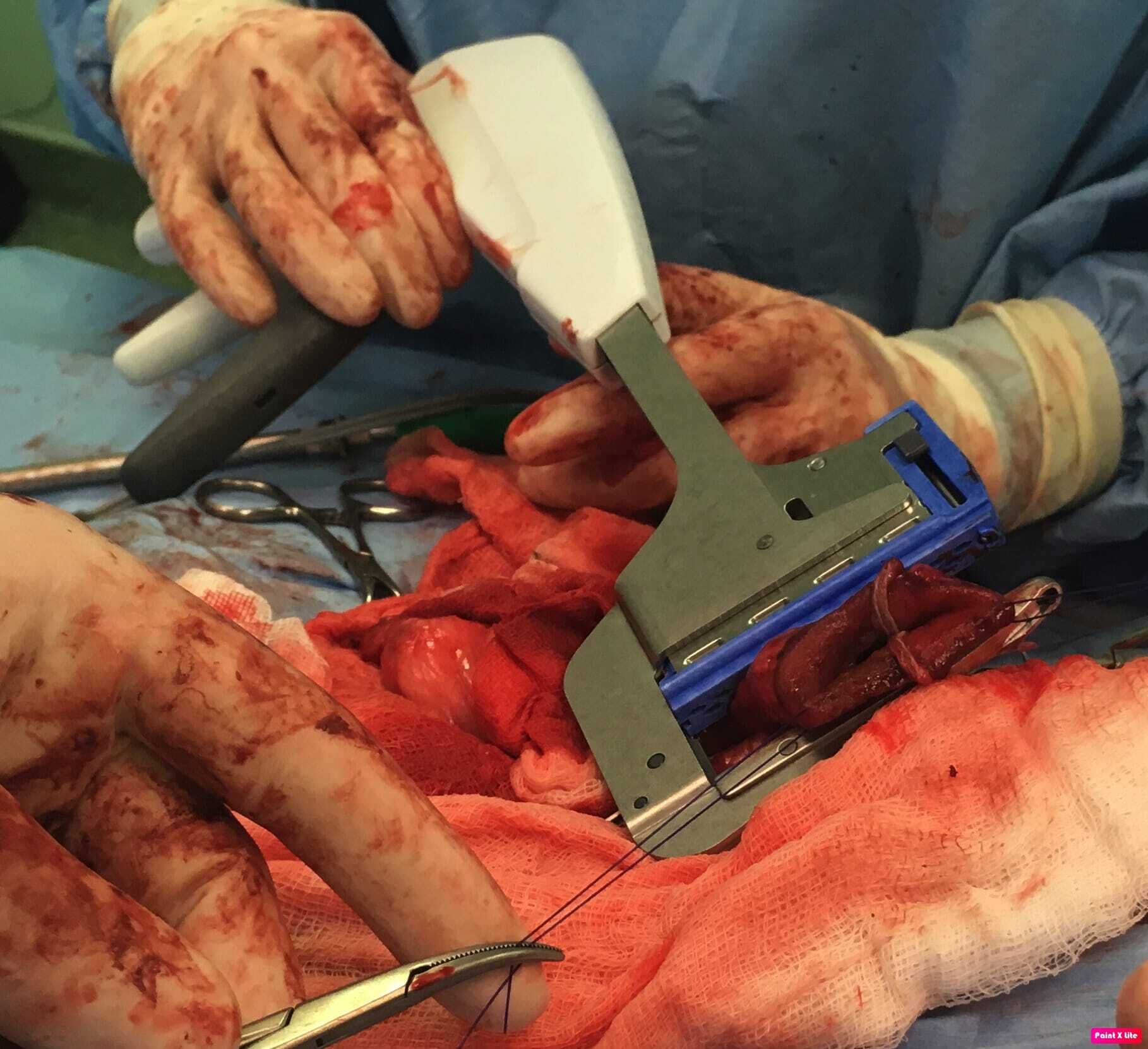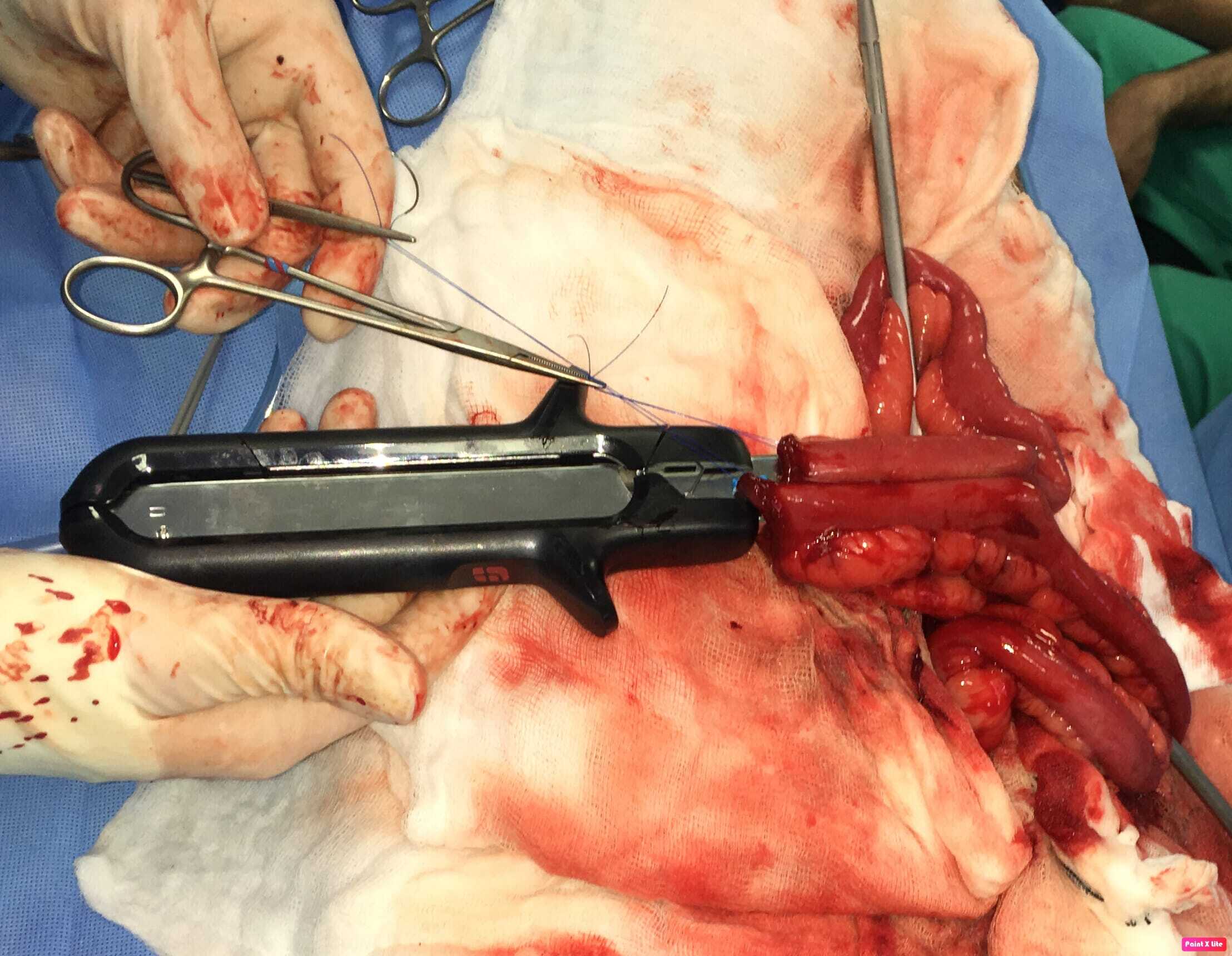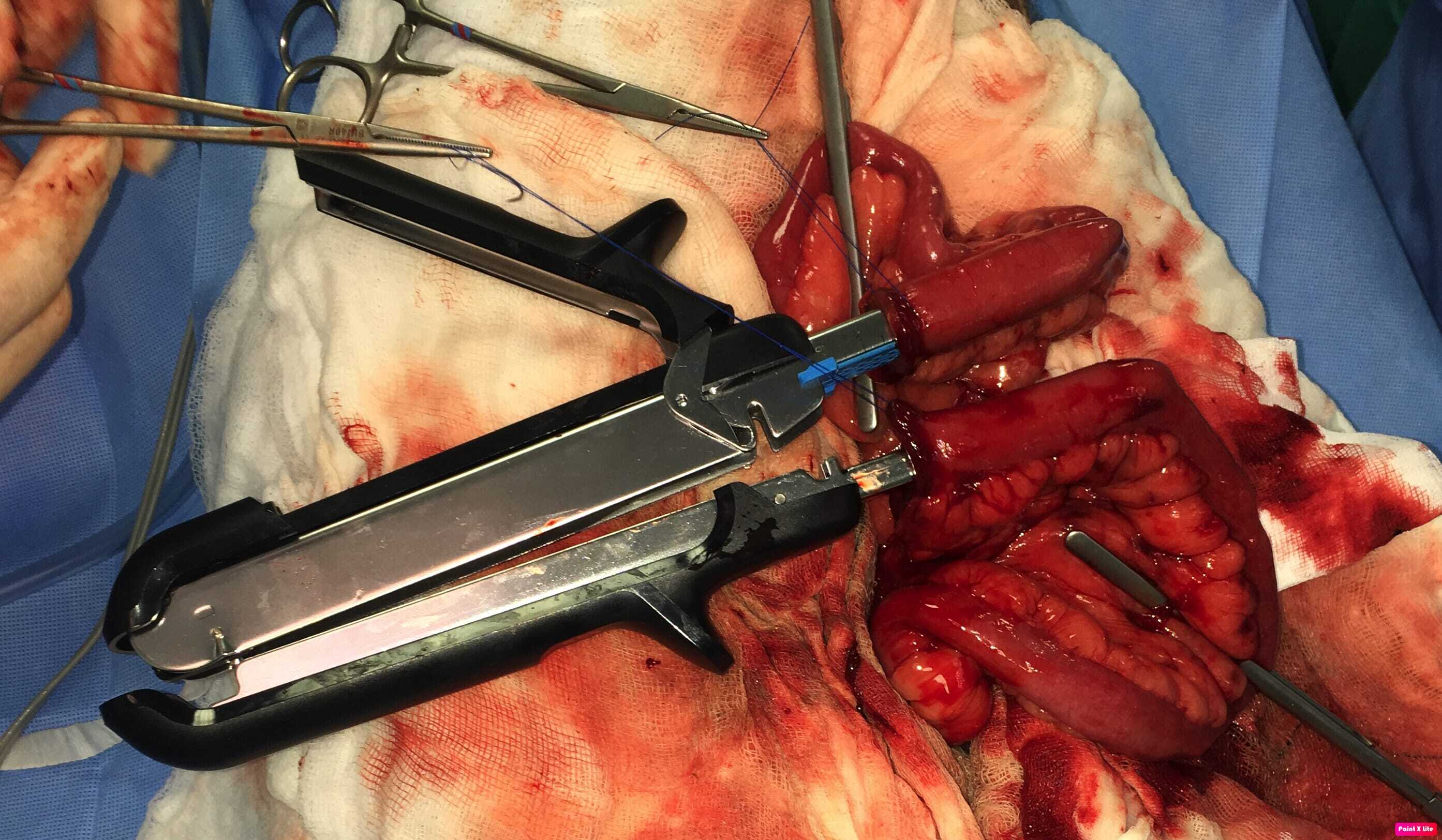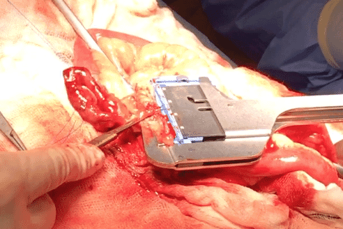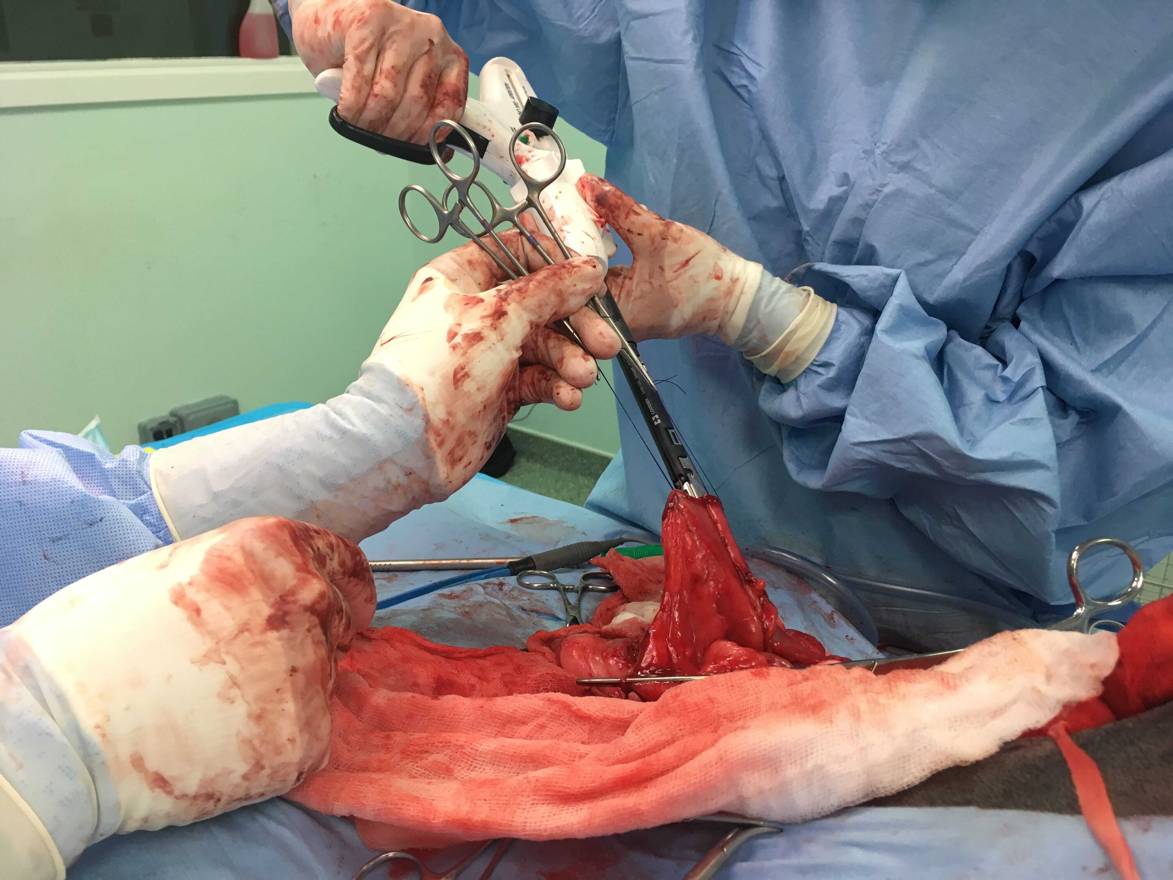 Intraluminal or extraluminal occlusion of the gastrointestinal tract is most often the result of neoplasia or foreign material. Oesophageal foreign bodies are best removed via endoscopy or fluoroscopy (approximately a 90 percent success rate). If they can be advanced into the stomach then surgical retrieval via gastrotomy rather than thoracotomy is less complex. Stay sutures are invaluable when performing gastrotomy to minimise the risk of spilling contents into the abdomen. Tissue viability of the intestines is typically assessed visually and by palpation (an experienced surgeon's assessment is 85 percent accurate), including identification of vessel pulses (thrombosed vessels are dark and do not blanch when compressed) and whether gut bleeds when incised. Sutured anastomosis following enterectomy is the most commonly performed method, using full-thickness single-layer simple interrupted or simple continuous suture patterns. The latter is preferable, as it is simpler, uses less material, is quicker and is more leak resistant. Surgical stapling devices can be used to create functional end-to-end anastomoses ( Box 1). Practitioners may be reluctant to use these devices based on lack of familiarity and cost but there are numerous advantages over traditional suturing, including considerably shorter surgical/anaesthesia time and a reduced risk of dehiscence in a septic abdomen. Overall, these reduce morbidity and cost. Box (1) Step-by-step guide to creating a functional end-to-end anastomosis using a linear stapling device and linear-cutter stapling device