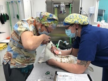 FIGURE (3) The author intubating the patient under the guidance of the veterinarian and lead registered veterinary nurse (RVN)