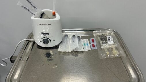 If the patient is to receive fluids, it is imperative to warm the fluids before use – a Tommee Tippee warmer is very useful for this (Figure 7). The author’s hospital administers fluids at 10ml/kg to patients undergoing procedures such as neutering. When the patient is under general anaesthesia, fluids are given slowly and intravenously over 15 minutes (thus reaching 2.5ml/kg over this period). If the fluids are not completely given throughout the surgery, the remainder can be administered on recovery.
