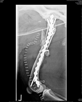 This is when the fracture fragments cannot be aligned. An IM pin is often driven through the furthest ends of the fracture to help align the fragments and then a plate is placed with screws in the proximal and distal parts of the fracture with the main part of the plate acting as a bridge across the gap where the fragments are. This helps to maintain alignment of the limb. Used alone in this way, the plate would be exposed to bending forces which is why it is often used alongside an IM pin as this will counteract these forces. Used in this way, the plate and pin will take on the load, giving the bone time to heal ( Figure 4; Conzemius and Swainson, 1999). The size of the plate and screws used will be determined by the surgeon based on preoperative radiographs. The size of the plate will determine the size of the screws; for example, a 2.0mm plate will always require 2.0mm screws, a 3.5mm plate will require 3.5mm screws, and so on.