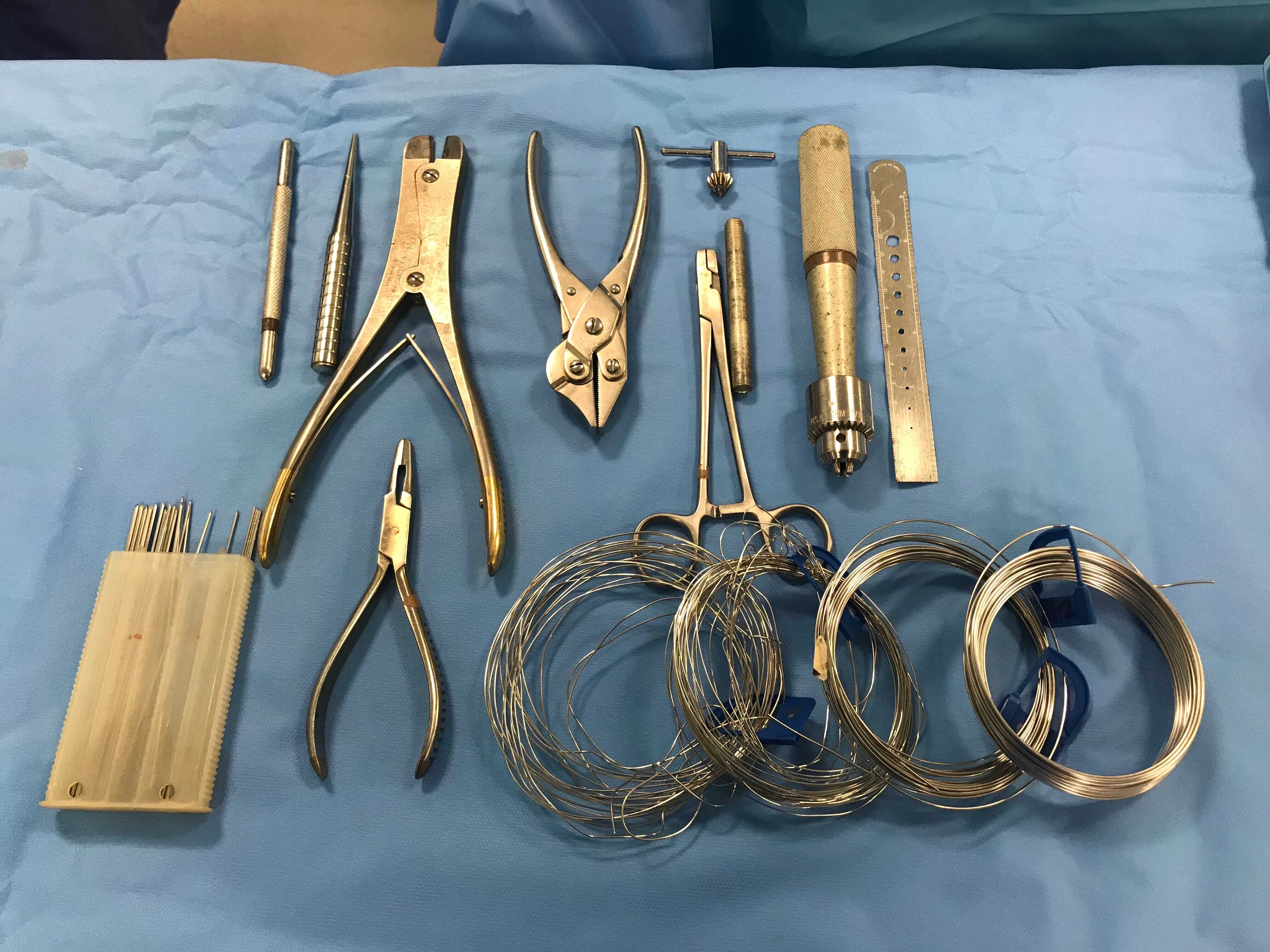 As is the case with a lot of surgical procedures, it is a good idea to have “kits” available which will contain instruments needed for a certain method, rather than opening these individually ( Figure 1). For example, in the case of IM pins and cerclage wire the surgeon will need a Jacobs chuck (with key and pin holder), cerclage wire in a variety of sizes, wire twisters and wire cutters.