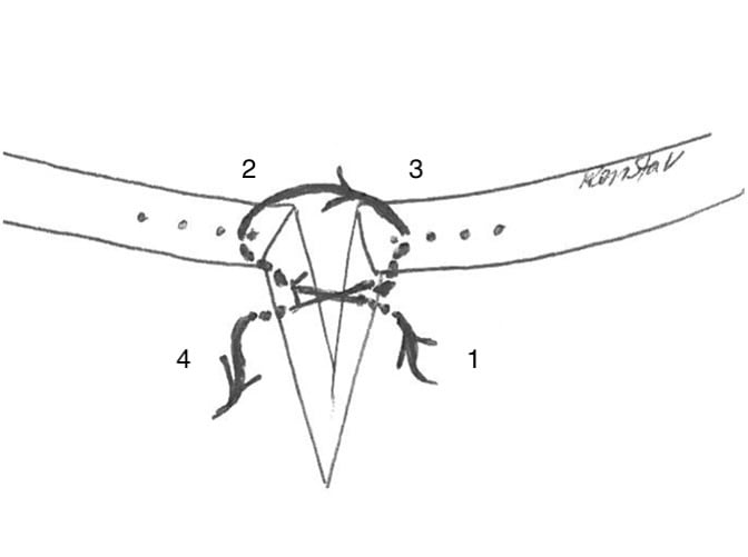 The surgical wound is then closed in two layers. The tarsal suture brings together the “tarsal” plates (deeper layer) of both eyelid margins using a far-near-across-near-far loop technique. This is followed by suturing the subconjunctival layers with 6-0 absorbable suture material using a simple interrupted vertical U suture or a continuous suture pattern. A figure-of-eight suture, bringing together the free eyelid margins, is performed by entering the skin of one eyelid approximately 2mm from the eyelid margin and 1mm from the wound, directed obliquely to the opposite side of the surgical wound.