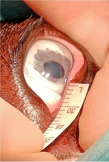A surgical technique described by Allgoewer (2024), which is also the author’s approach, allows for the removal of a greater length of both the upper and lower eyelids, resulting in a greater reduction of the palpebral fissure. This can be particularly beneficial for patients who require it. The length of the eyelid to be removed can be measured with a Schirmer tear test paper strip or callipers (Figure 2A). Increased visualisation of the canaliculi can be achieved using a Nettleship dilator if necessary (Figure 2B). Both the upper and lower puncta are incised with surgical scissors (Figure 2C), and the canaliculi are opened from the puncta down to the medial fornix.