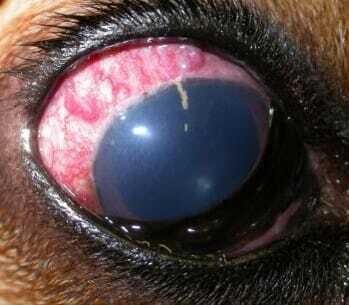 In most cases, while it looks very white as we cannot see into the eye, the dog actually often sees out well enough for normal general behaviour. The most important thing is working out whether the oedema is caused by glaucoma (Figure 1), a much more concerning condition. In that case, the episclera of the eye would be red with engorged vessels.