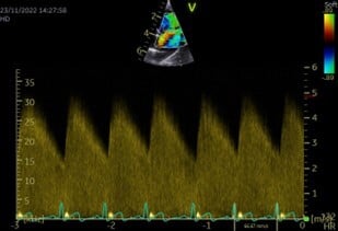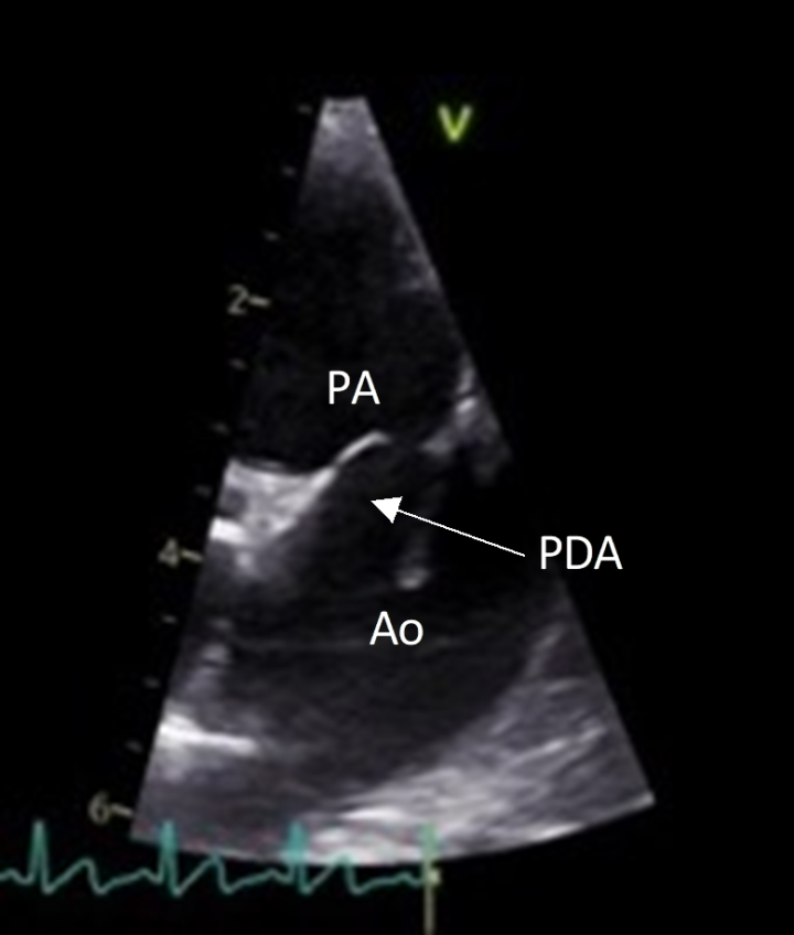 Due to its characteristic murmur, the index of suspicion for an uncomplicated (“left-to-right”) PDA may be high from physical exam findings alone; however, a definitive diagnosis requires echocardiography. The ductus can typically be visualised entering the pulmonary artery (Figure 1), and continuous flow through the duct is apparent on spectral Doppler imaging (Figure 2). Left-sided cardiomegaly may also be apparent.