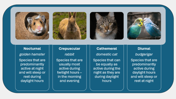 Species can be classified as diurnal, crepuscular, nocturnal or cathemeral depending on their preference for when to be active during a 24-hour period (Figure 1). Owners should be aware of when their pet is likely to be active, and thus perform a wider diversity of behaviour patterns, to ensure that housing and care facilities meet the species’ behavioural needs.