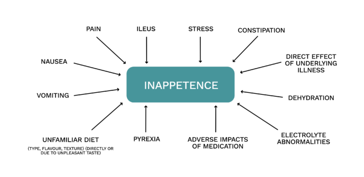 In the veterinary clinic, the two most important influencers of effective post-operative nutritional support are the selection of an appropriate diet and ensuring the patient’s intake meets their calorie requirements. There may be a large number of causes of inappetence in hospitalised patients, some of which are detailed in Figure 1. Undernutrition is unfortunately common: in one study conducted, 84 percent of hospitalised dogs consumed less than 25 percent of their energy requirement, and only 3.4 percent of the dogs met their requirement (Molina et al., 2018). Furthermore, an association was found between inadequate energy intake and death (Molina et al., 2018), so focusing on meeting calorie needs is key. For most patients in the hospitalised setting, calculation of their resting energy requirement (RER = (body weight in kg)0.75 × 70) provides a useful starting point.