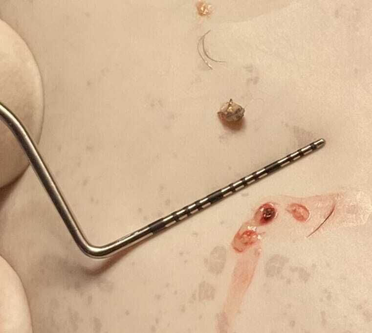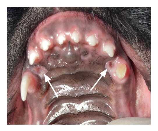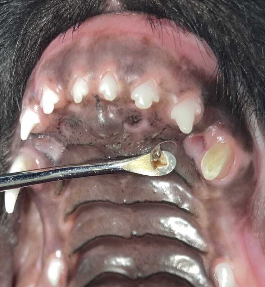 Impaction of debris into soft tissue at impingement defects cause either persistent or recurrent focal inflammation. This should always be anticipated but can only be confirmed with investigation under sedation or general anaesthesia. Exploration of these impingement defects often produces a variety of foreign material. Owners often report that affected puppies are keen chewers of anything within reach. Any debris trapped in these impingement defects is very difficult or impossible to dislodge. In most cases, accumulated pebbles, plant material and food remnants, some several millimetres across, are forced into these lesions every time the mouth closes! The resultant inflammation contributes to the pain ( Figure 2).