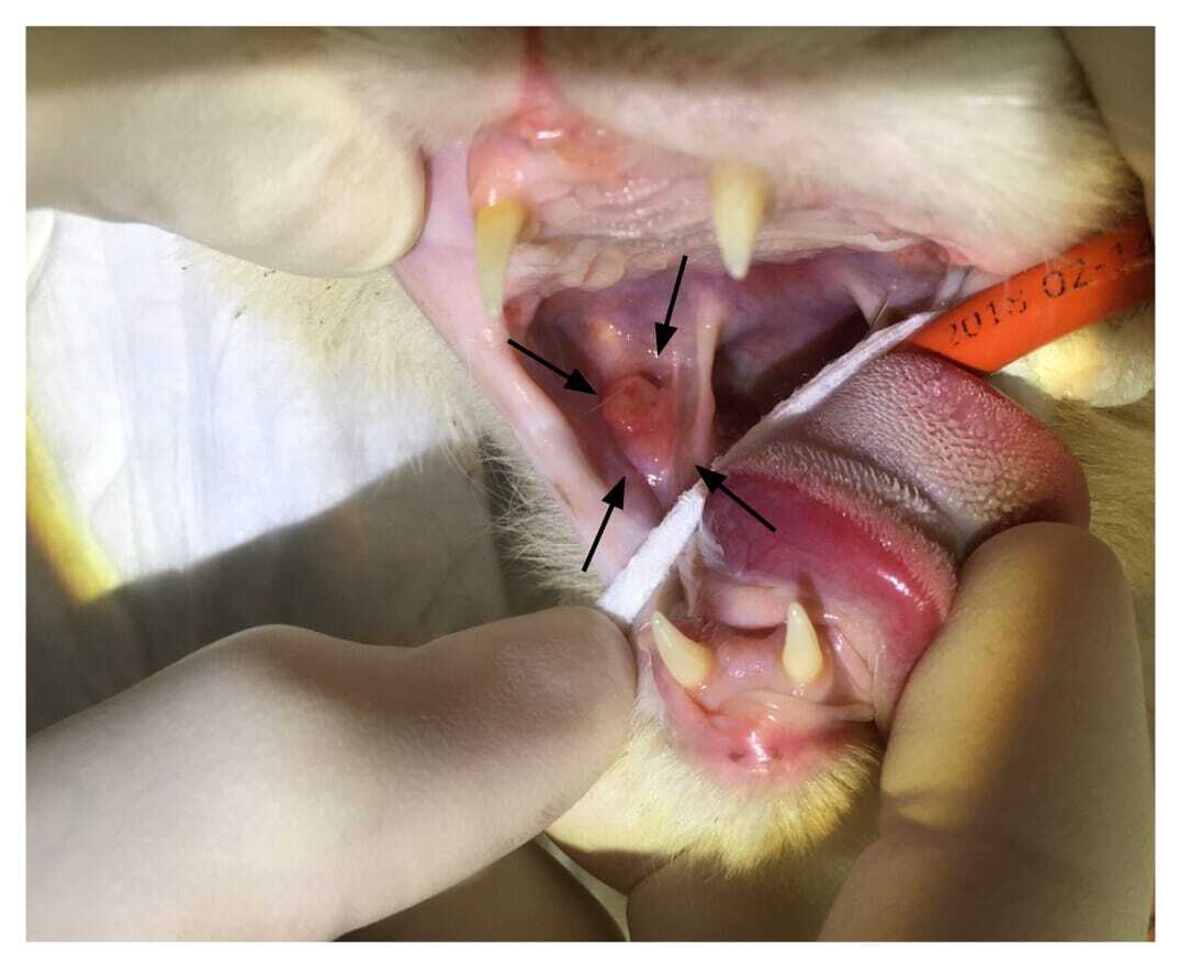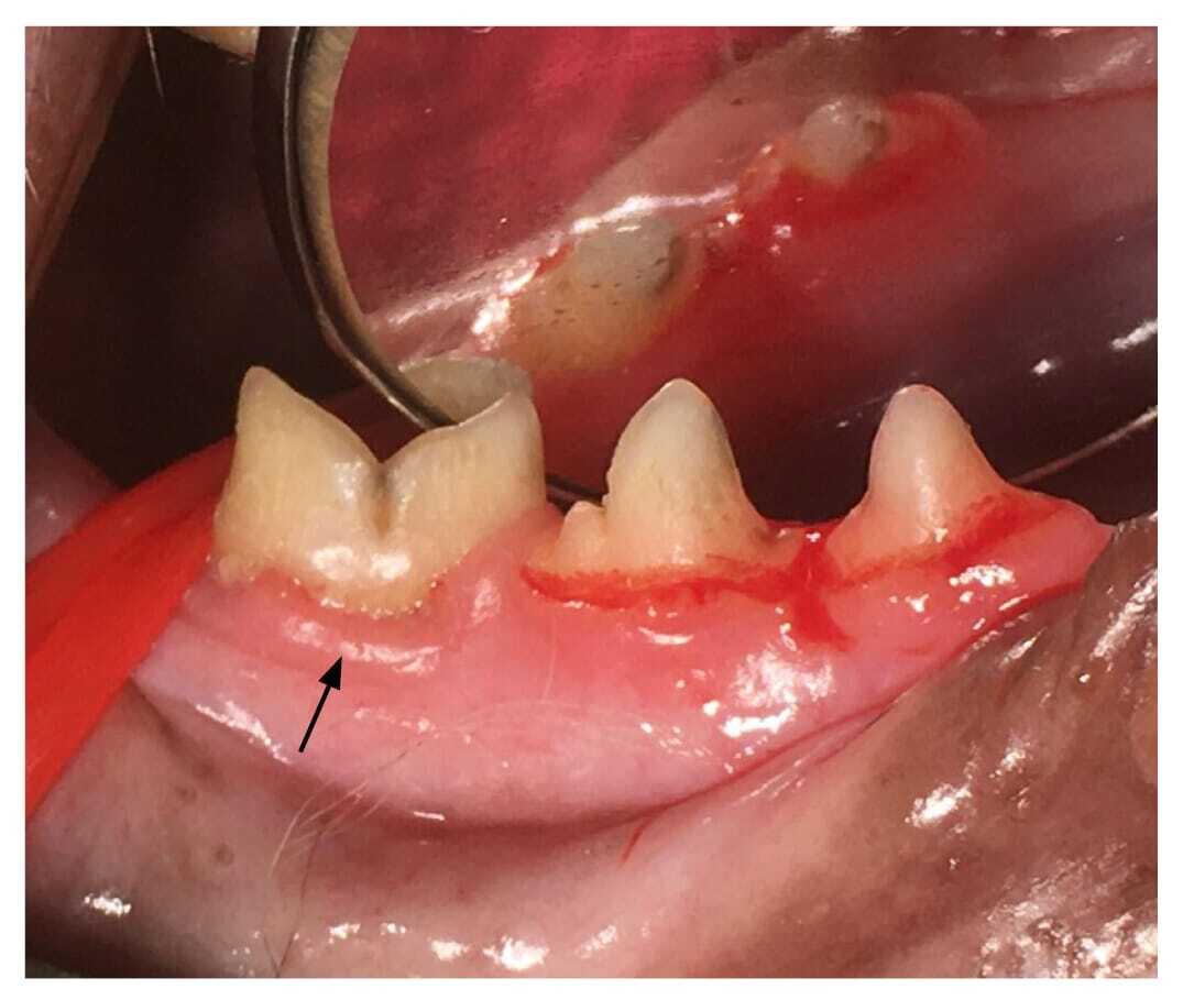 In cats, the impingement of maxillary third and/or fourth premolar teeth on the buccal gingiva and/or oral mucosa of the ipsilateral, opposing mandibular dental arcade can possibly be associated with a narrower lower jaw. In some cases, abnormal angulation of the maxillary premolars causes palatoversion of the maxillary third and/ or fourth premolar teeth, that then impinges on the soft tissue. The painful ulceration at the impingement defects can also cause damage to the gingiva and often leads to gingival recession and other signs of periodontitis, affecting the associated mandibular teeth (Figure 6). The chronic irritation caused by this malocclusion is considered to be the main contributing factor to the development of inflammatory granulomas (“pyogenic granuloma”) at this site (Figure 7).