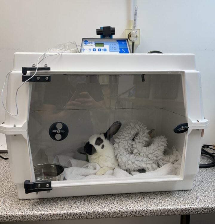 Following the cessation of surgery and anaesthesia, the patient’s temperature should be monitored closely. This is because most rabbits are already hypothermic at the start of the procedure and the open abdominal body cavity, as well as the use of saline on the viscera during surgery, can reduce the body temperature further. Active warming should be used, such as a warm air incubator, warm air blanket or a heat mat (Figure 8); however, patients should not be left on a heat mat if they are unable to move during recovery from anaesthesia. In addition, the rectal temperature of the patient should be monitored closely to ensure hyperthermia is not caused.