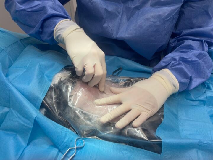 The ventral abdomen should be clipped of hair from approximately 2.5cm cranial to the xiphoid process to roughly the level of the pubis. Rabbit skin is very thin and fragile, so care should be taken when clipping to prevent clipper rash or tearing of the skin. Surgical preparation should be performed as standard, with either chlorhexidine or iodine-based disinfectants, followed by a final preparation with surgical spirit (Varga, 2013).