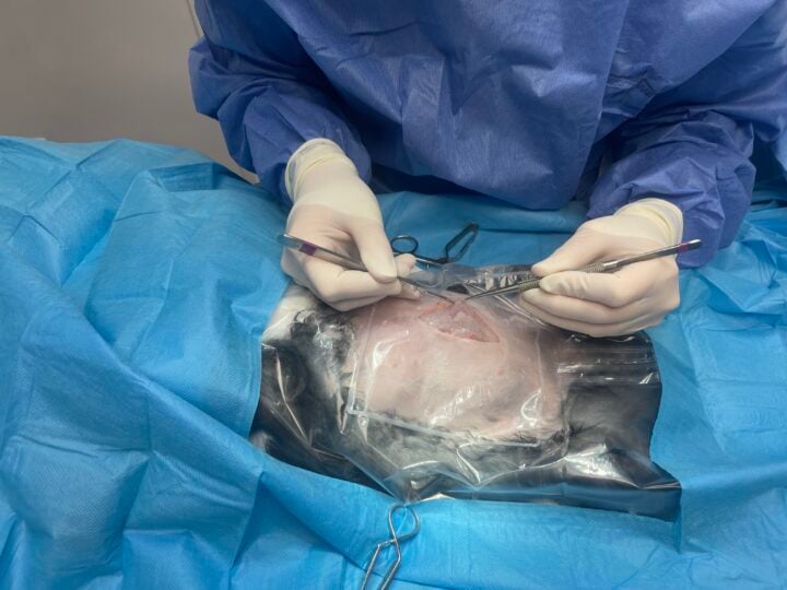 There is often very little subcutaneous tissue, and you can usually identify the linea alba through the skin incision alone. To enter the abdomen, the linea alba should be grasped with atraumatic forceps and tented upwards. Palpate the tented muscle to ensure no organs are present between the layers of muscle.