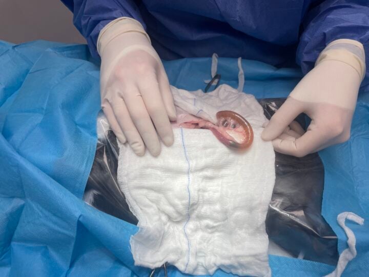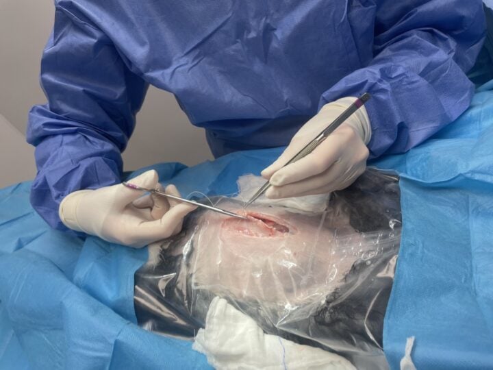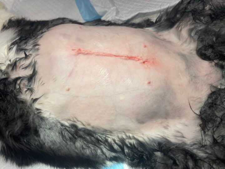 The abdominal wall can be closed with an absorbable monofilament suture using a simple continuous pattern (Figure 6). The lack of subcutaneous tissue means that a subcutaneous closure is rarely required unless the patient has excess abdominal subcutaneous fat. The skin should be closed using an absorbable monofilament suture with an intradermal pattern to help prevent post-operative patient interference (Figure 7).