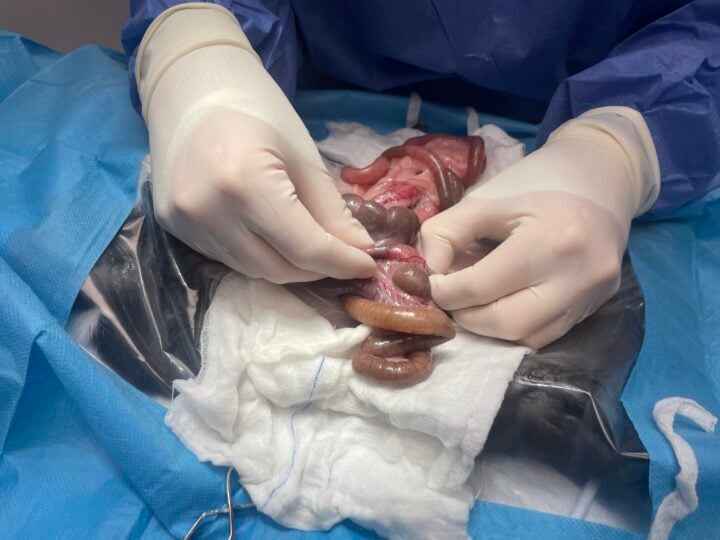 Once the obstruction has been identified, there are two described techniques for relieving the obstruction. Milking the obstruction distally to the caecum is advocated in most cases. This is where the obstruction is very gently pushed distally to the ileocolic valve and through into the sacculus rotundus of the caecum (Figure 5). The gastrointestinal diameter from the caecum distally is much wider than the small intestine, so there is no risk of further obstruction as long as the obstruction is milked fully into the caecum.