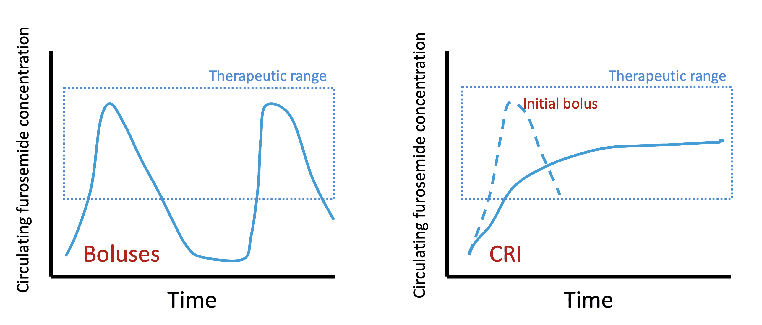 Although most centres do not use a furosemide constant rate infusion (CRI) first-line, it is a good option for cases where multiple boluses of furosemide have seemed ineffective, or even for circumstances where we wish to control the diuretic dose (either not have enthusiastic colleagues cause dehydration overnight, or not have doses missed if the ward team is very busy). The literature suggests that a furosemide CRI produces similar diuresis to intermittent boluses in dogs, but it may avoid peaks and troughs in intravascular volume which has been associated with a greater risk of renal injury in humans ( Figure 3).