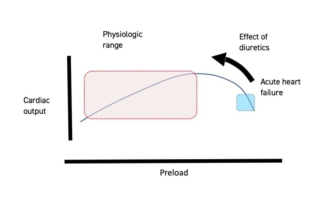Dilated cardiomyopathy causes poor output in combination with pulmonary oedema. Mitral regurgitation may or may not be present, but the most important factor impeding this dog’s recovery is poor systolic function and therefore low cardiac output. Some clinicians express concerns about administering diuretic drugs to patients with hypotension and pulmonary oedema, fearing renal injury or worsening of hypoperfusion. However, increased preload (blood volume) in dogs with severe systolic dysfunction can itself reduce cardiac output. If preload is reduced with furosemide, output should increase (or at least not reduce significantly) in DCM ( Figure 5). Some heart diseases, such as mitral stenosis, are relatively preload dependent, so dogs with this problem (rare outside of the English Bull Terrier) should receive more cautious diuretic doses.