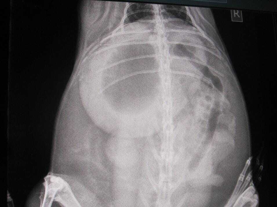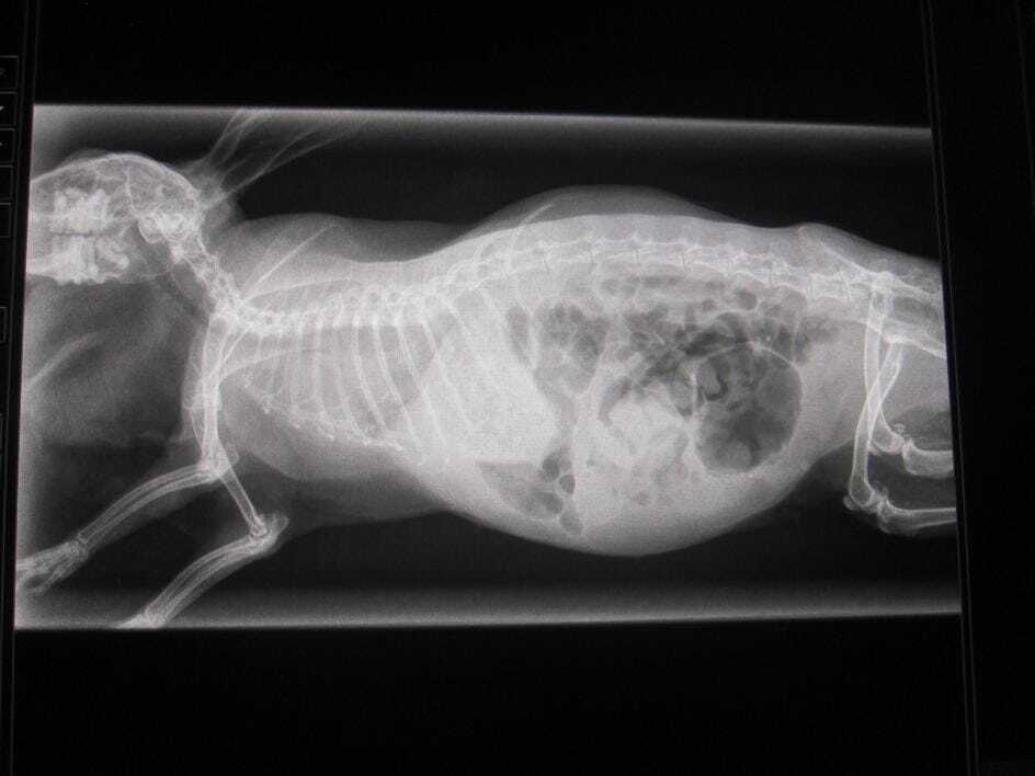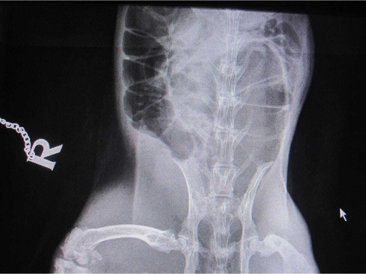 Where an obstruction is suspected, it is useful to check a blood glucose level. Rabbits that have very high blood glucose when in gut stasis are more likely to have a gut obstruction, although this is not diagnostic. If the blood glucose is high, then X-rays (Figures 1 to 3) or ultrasound should be used to further rule in or out an obstruction.