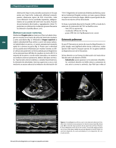 obtenidos mediante acceso paraesternal derecho de eje largo (A) y de eje Figura 3. Ecocardiogramas de dos perros con estenosis pulmonar mostrando imagen en mosaico debido a un flujo turbulento de