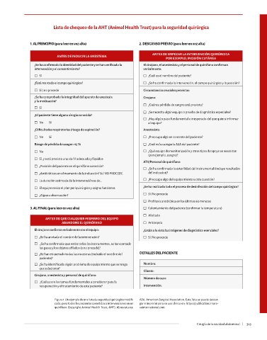 quirúrgica reduce significativamente la frecuencia y la grave- (fig. 5). A continuación, se abre la línea alba en toda su longi- Figura 1. Un ejemplo de una lista de seguridad quirúrgica modifi- ASA, American Surgical Association. Esta lista se puede descar-